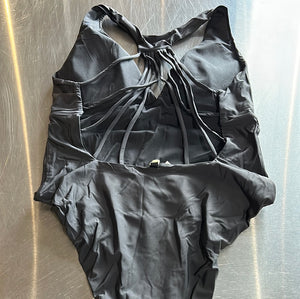 Removable soft cup, recycled fabric, macrame T back, high leg, moderate coverage, fully lined