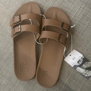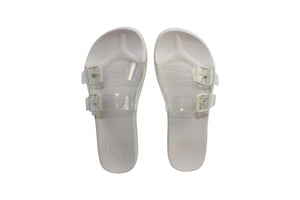One piece molded EVA footbed with arch support and toe pillow for extra comfort. Translucent straps with metal buckles.